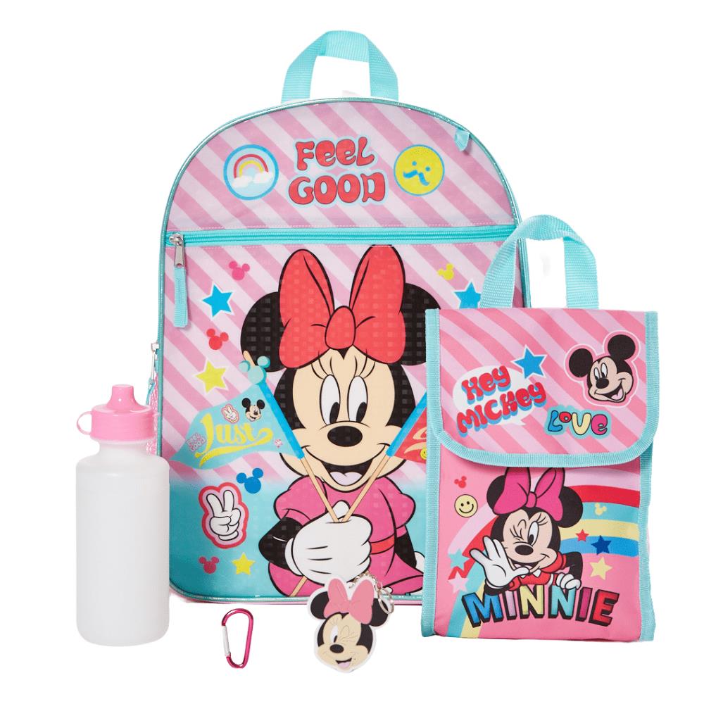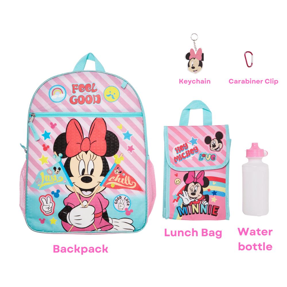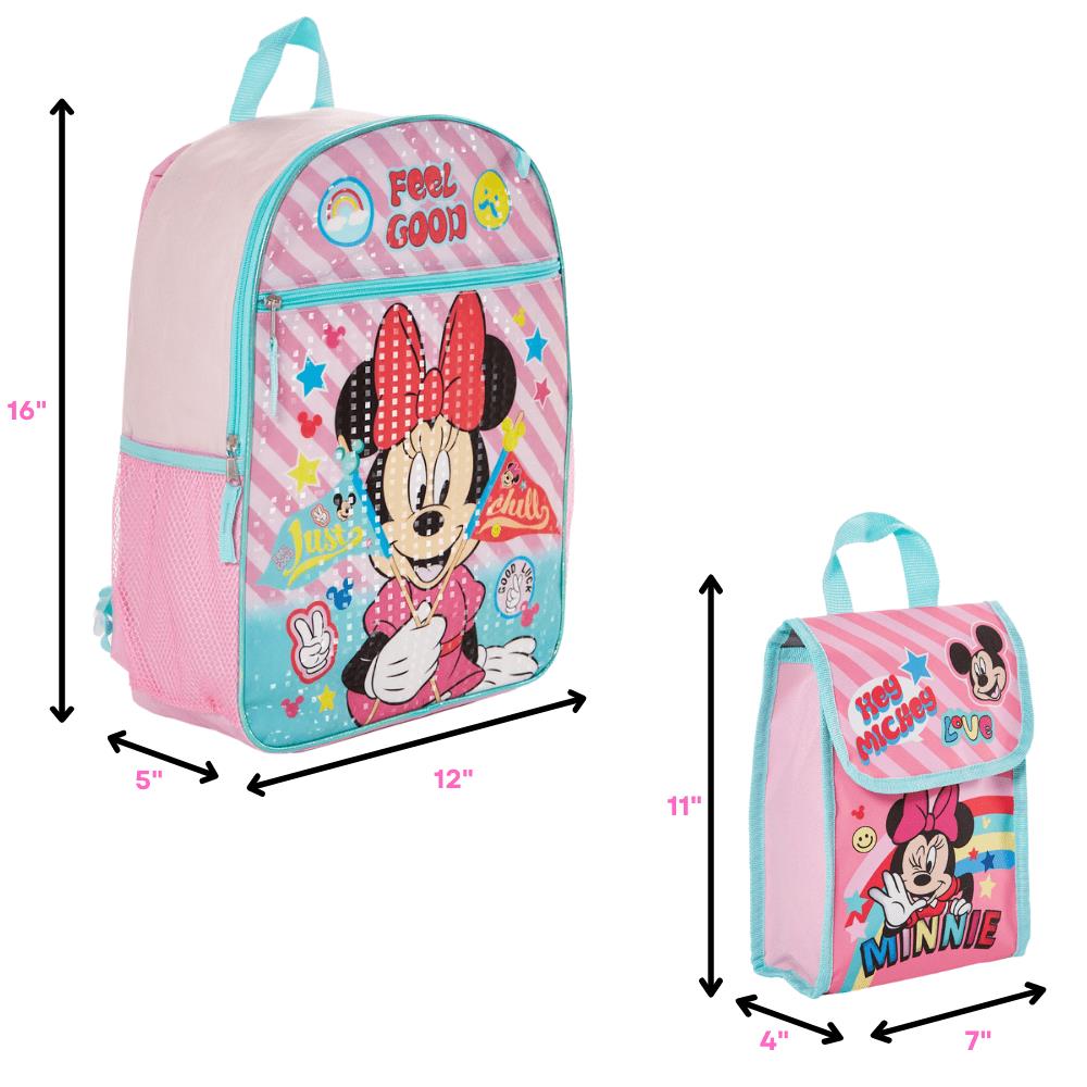 • 5PC MINNIE MOUSE BACKPACK SET ? Perfect for kids aged 3 years old and up, the complete back-to-school bundle includes a large backpack (16 x 12 x 5) featuring Disney?s Minnie Mouse with two mesh side pockets and a large front zip pocket, a soft lunchbox, a water bottle, a rubber keychain, and a carabiner clip.